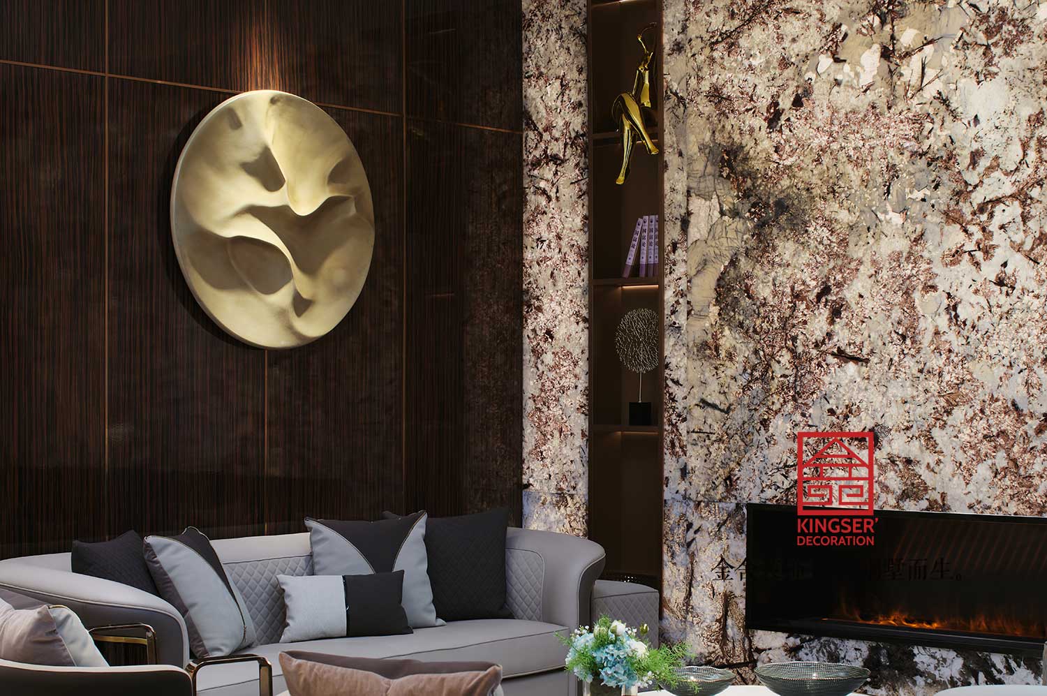 輕奢氣韻的基調(diào)打底,點睛的玩色主義唱和,高冷的灰色調(diào)大理石、搭配上簡約融合純色調(diào)的家具擺設,都市新貴的時尚姿態(tài)跳脫而出。