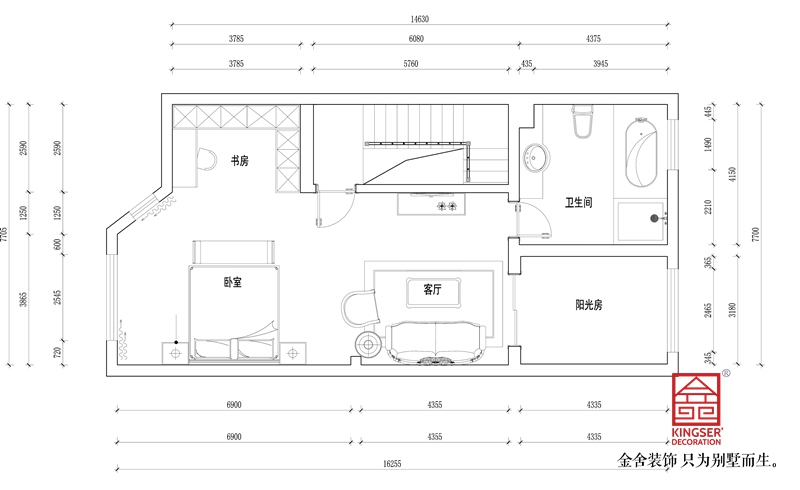 二層:在挑空區域的兩邊新砌了墻體,使得兩間臥室增強私密性,同時也使一層的挑空更完整。