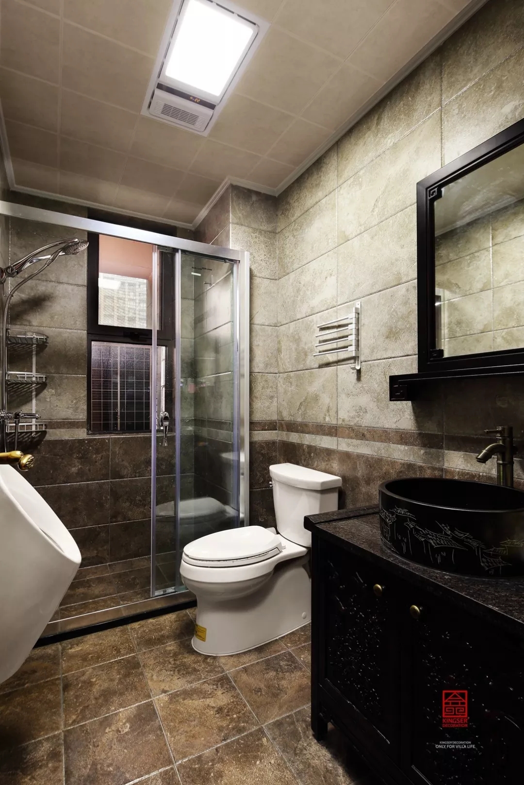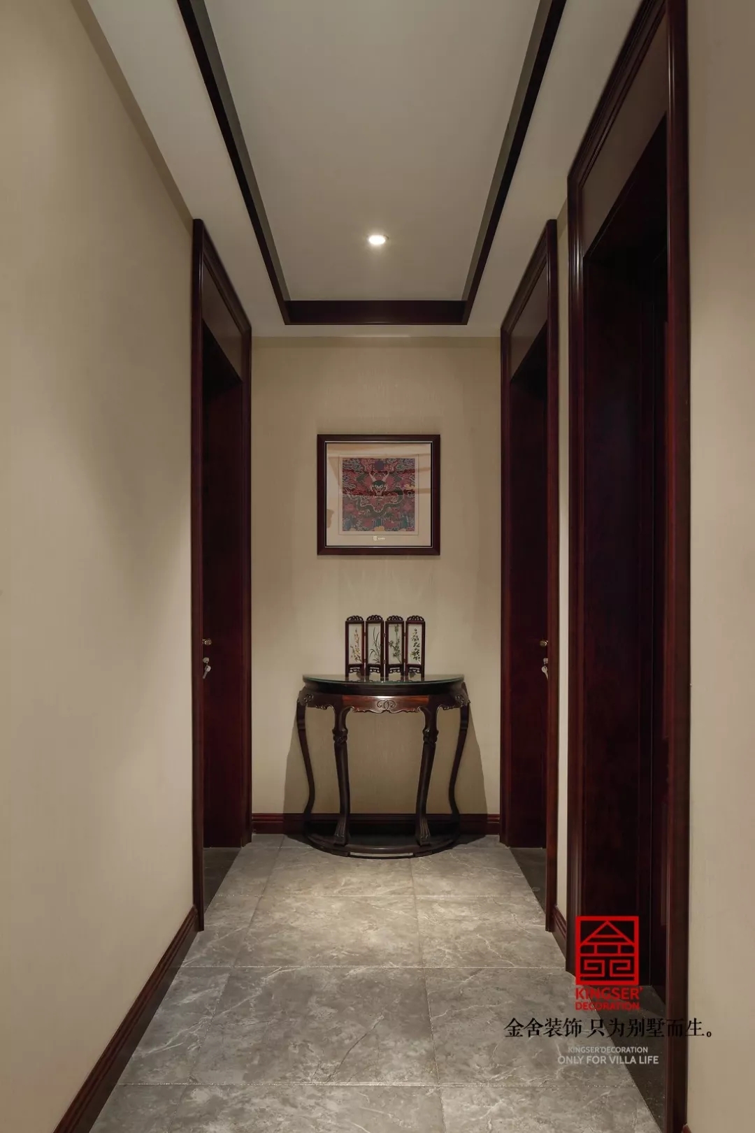 玄關依然是對稱的風格,玄關和背景墻都被凸顯的非常有意境,從木質的桌子到整個空間的設置,仿青磚的地磚,讓整個空間中透露出一種古樸的意味,歷史的滄桑感迎面而來,讓整個空間即有特色又能感受到設計師特有的匠心。