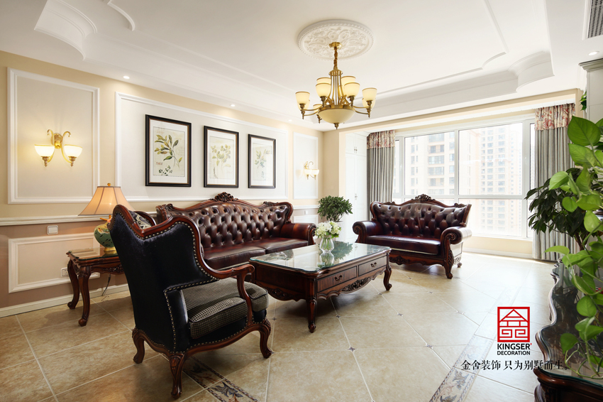 石家莊別墅裝修設計的客廳的布置頗有一種美式風格的典型特征,厚重感十足的沙發搭配墻面淺色的畫作,嚴肅又帶有幾分輕松的感覺。客廳中綠色的盆栽給空間增加了幾分活力,墻面的造型搭配淡雅的燈光,靈巧純潔,恬靜活潑,柔和中流露出激情。