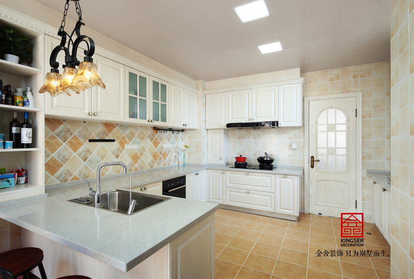U形櫥柜將廚房的面積劃分成兩個不同的空間,將酒吧與櫥柜整合在一起,在美式開放式廚房的效果中給人們一個封閉的空間,從而使整個廚房空間得到充分利用。