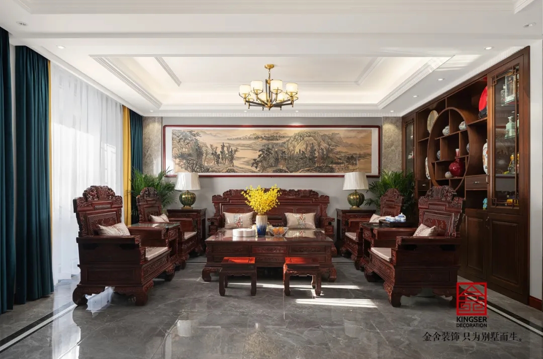 此案例為石家莊金舍裝飾-大者別墅300平米新中式風格裝修實景。客廳空間運用木質的材質組合搭配,帶來視線的清涼質感,同時中式的端莊典雅又慢慢在空間散發開來。古銅色的吊燈精致而特別,立體感十足,柔和了空間氛圍。中式的古木家具沉靜而典雅,細致的雕花設計凸顯主人的不凡品位。而地板的大理石紋理又很合適宜地給空間帶來了時尚的現代氣息,非常愜意。
