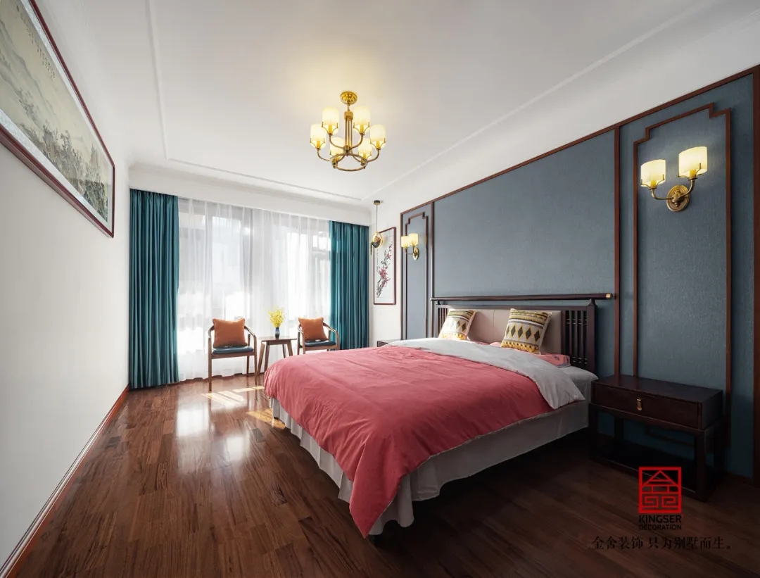 餐廳的圓形餐桌與方形吊頂相呼應,完美的嵌入了“方圓之間”的東方生活美學。既保留了原有頂面的高度又合理的劃分了空間,讓空間看起來更寬敞。餐廳背景墻的工筆花鳥更是提高了整個空間的靈動感,似在平淡的生活增加一份閑趣,讓家人在一飲一品之間感受生活的幸福。