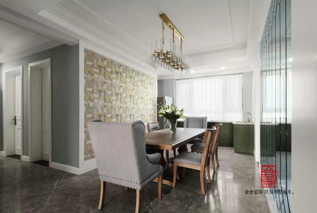 精致的裝飾細(xì)節(jié)表現(xiàn)了設(shè)計(jì)師的細(xì)膩,從大空間到小細(xì)節(jié),都在做整體呼應(yīng),金屬與木質(zhì)的配合,表現(xiàn)了對品質(zhì)生活的向往,大面積的灰體現(xiàn)出來的高級感,簡單流暢的線條,讓整個(gè)空間既舒適又時(shí)尚。餐廳內(nèi)造型充滿現(xiàn)代感的金屬吊燈,讓整個(gè)空間更加柔美,形成一個(gè)溫馨的用餐環(huán)境。餐廳背景墻的銀色鏡子更是增加了就餐時(shí)的趣味。