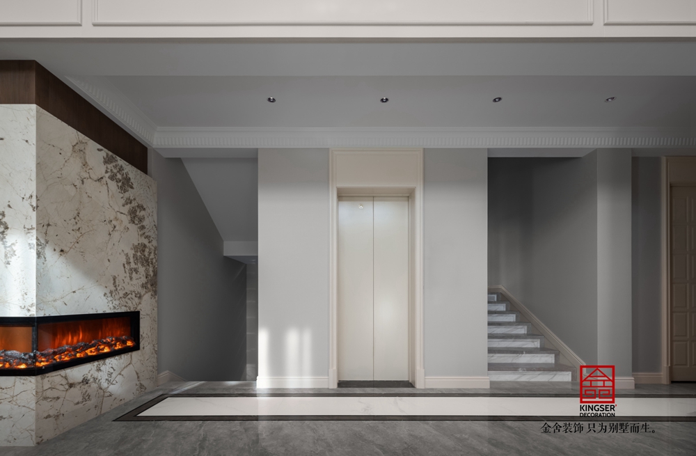 別墅的客廳,無疑是整棟建筑中的璀璨明珠。在挑高六米的宏偉空間中,我們巧妙地布置了一個簡約風格的轉角壁爐區,與素色沙發相映成趣,營造出一種既現代又舒適的氛圍。