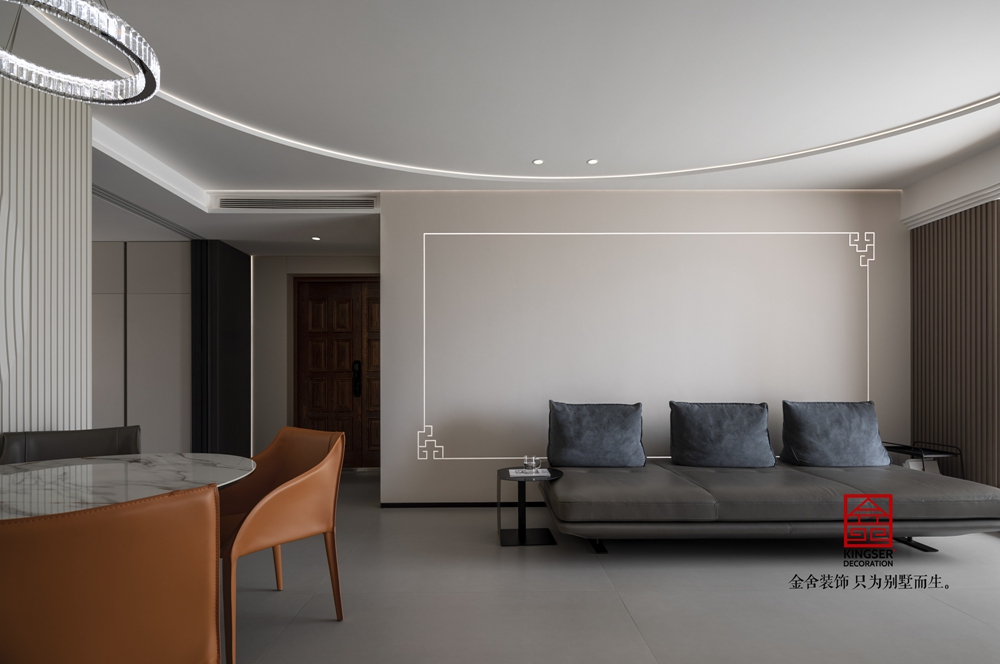 客廳空間沒有安置茶幾,這種無(wú)茶幾的設(shè)計(jì) ,讓整個(gè)空間看起來(lái)更加的寬敞,本身就是一家五口,這樣的設(shè)置,也給了孩子足夠的運(yùn)動(dòng)空間,沙發(fā)背景墻用燈條拼接而成,中式紋理的也被制作了進(jìn)去,讓整個(gè)空間充滿文化的氣息。