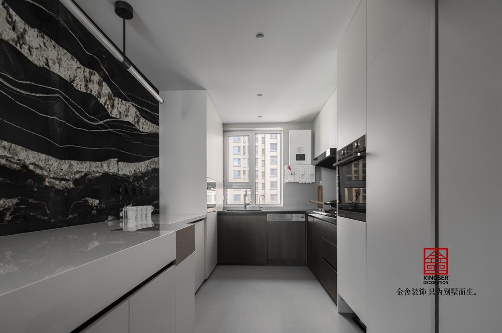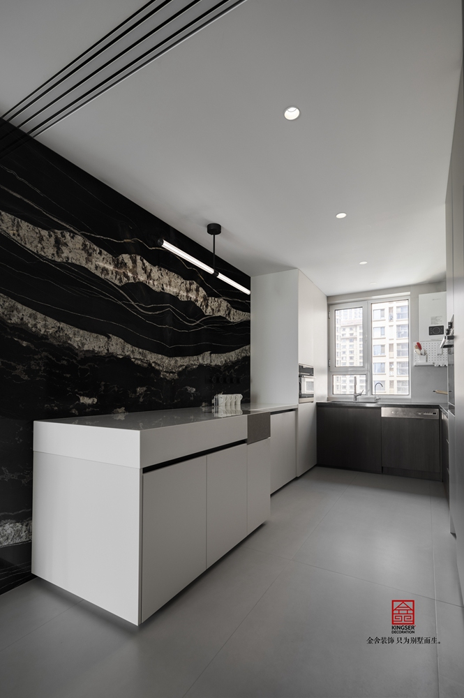 乍一看起來(lái)是一個(gè)開敞的廚房,其實(shí)還做了一個(gè)隱形門,既保證了采光,也讓整個(gè)空間更加的舒適整潔,黑與白相間的背景石材如同江河奔涌,充滿了未知與希望。