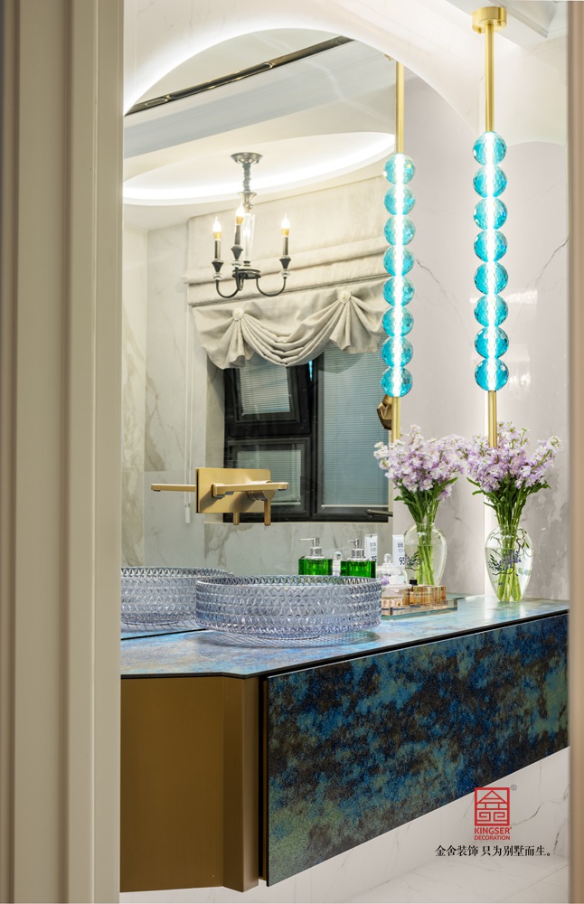 藍(lán)色多瑙河是這個(gè)空間的主調(diào),不同純度,明度,亮度的藍(lán)色,讓空間高級浪漫,主衛(wèi)打分最高,純純的法式浪漫情懷,淺海藍(lán)的透明浴缸,加之金屬銅色,奢華感十足。