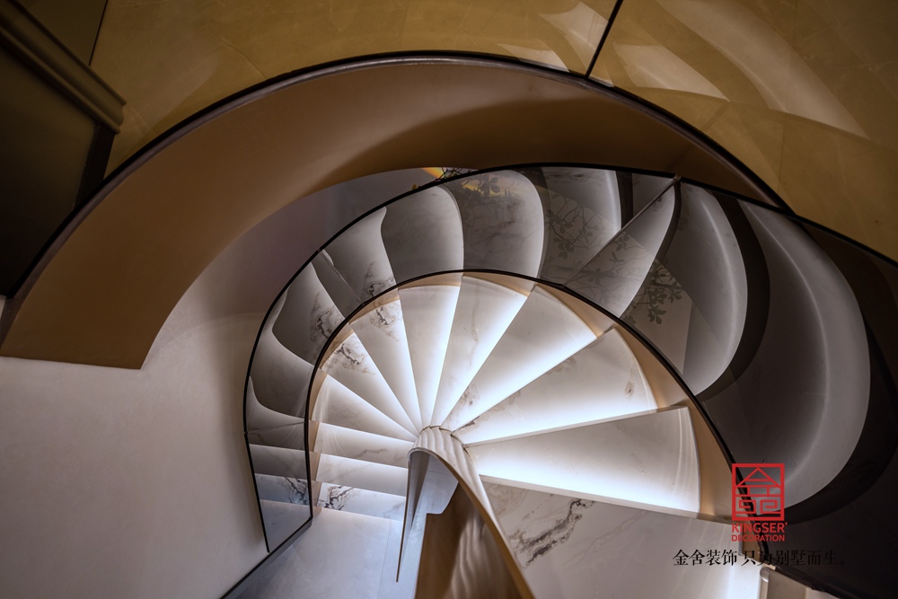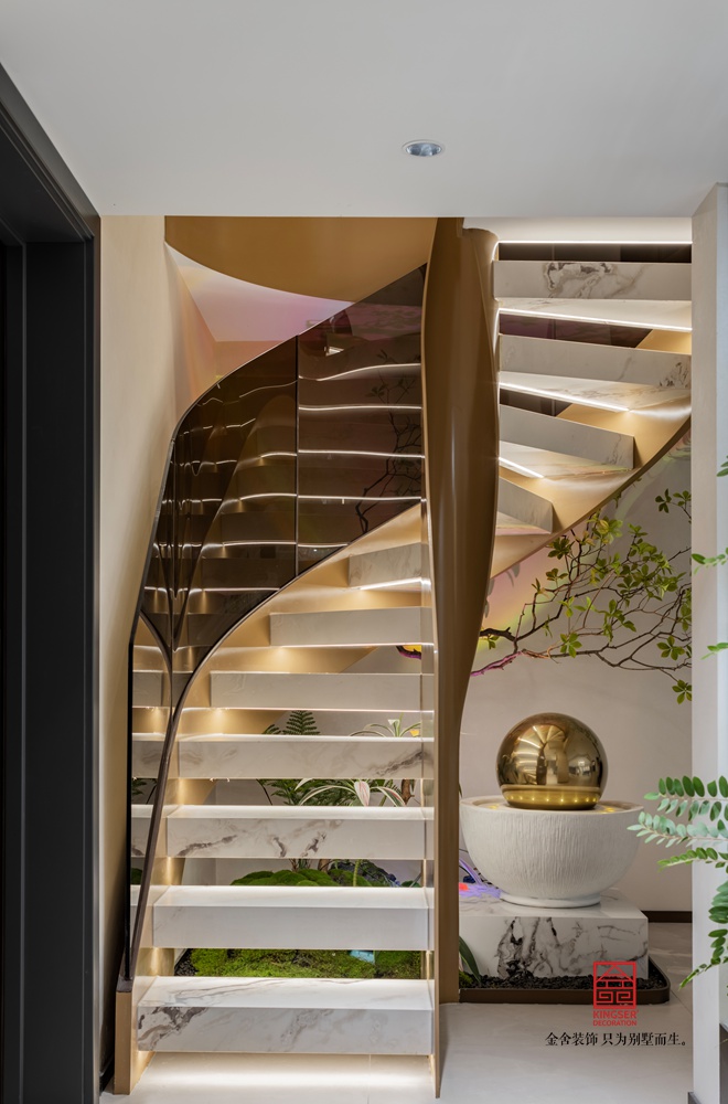 螺旋線條復(fù)刻鸚鵡螺自然韻律,金屬扶手勾勒利落光影,石材踏板沉淀溫潤質(zhì)感。剛?cè)崤鲎查g,讓樓梯不止是通行空間,更成為家居里自帶焦點(diǎn)的藝術(shù)裝置。