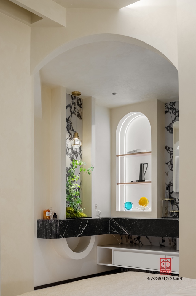 女孩房是典型的奶油風(fēng),通過兩房變一房的手法,再通過兩道拱形造型,使得兩個(gè)空間分離又關(guān)聯(lián),更為突出的是干區(qū)洗手臺,寶格麗極具時(shí)尚感的材質(zhì)和負(fù)一女孩房衣帽間玄關(guān)遙相呼應(yīng),整體感兼具。