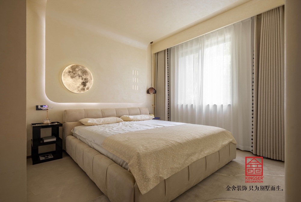 負(fù)二樓的臥室是客房,淺木家具配米白加金色床品,透著溫潤感。飄窗邊設(shè)陽光區(qū),擺著幾個(gè)抱枕,夜晚枕著柔和燈光,能給來客一份歸家般的安穩(wěn)。