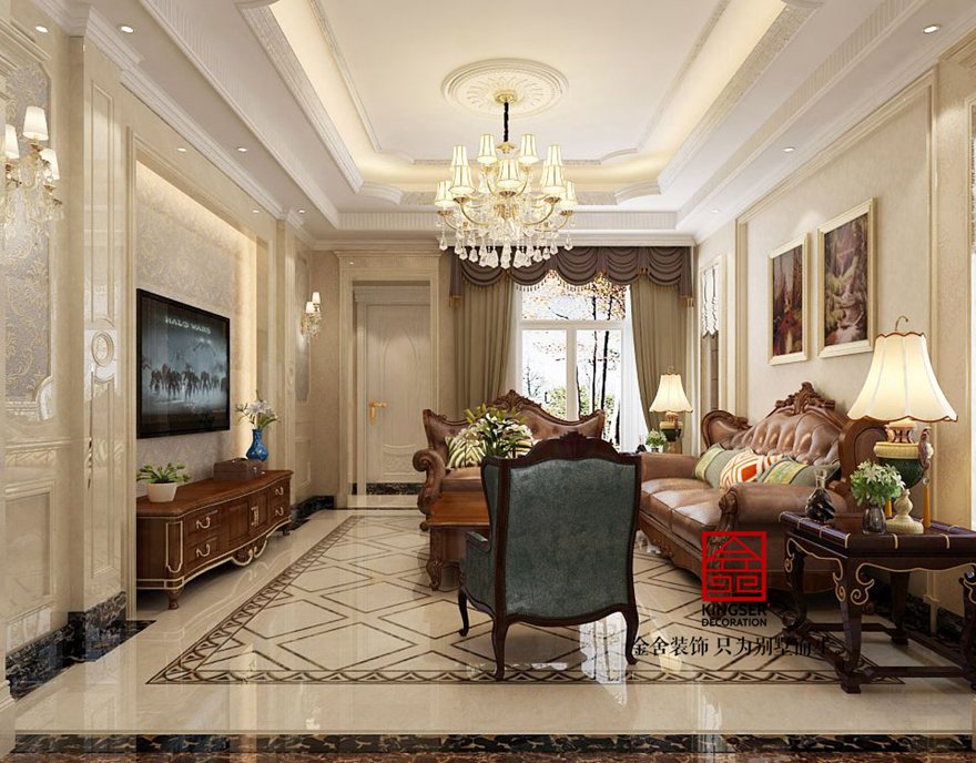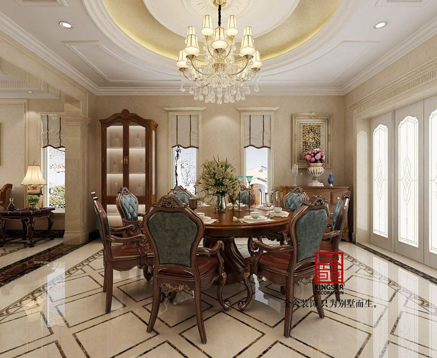 設計說明:此案例為石家莊金舍裝飾-原河名墅400平米歐式風格裝修效果圖。沒有純歐式的繁亂,客廳與臥室的對比繁簡統一,讓人心情平靜。椅子藍色皮質與臥室藍色布藝相輝映,使之更為整體。束花裝飾點綴及綠植擺設使整個空間更加清新田園。田園氣息讓人在忙碌的都市多了份愜意和滿足。金屬材質以及水晶吊燈讓整個空間更為時尚、大氣。真正做到了大氣而又內容。