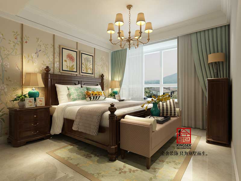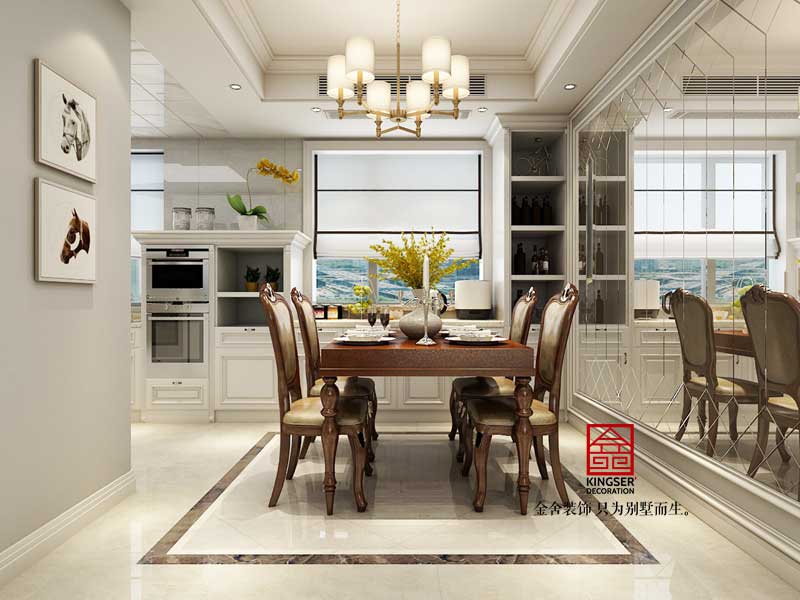此案例為石家莊金舍裝飾-德賢公館164平米美式風格裝修效果圖。美式風格設計理念表現為追求華麗、高雅的古典風格。居室色彩主調為白色,家具為古典彎腿式,家具、門、窗漆成白色,擅用各種花飾、豐富的木線變化、富麗的窗簾帷幄是西式傳統室內裝飾的固定模式,空間環境多表現出華美、富麗、浪漫的氣氛。
