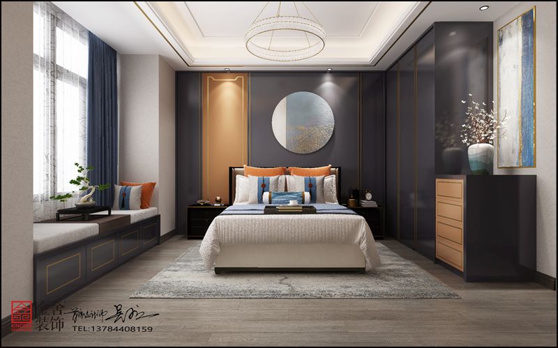 設計方案中輕奢新中式風格臥室的色彩設計受現代繪畫流派思潮影響很大。通過強調原色之間的對比協調來追求一種具有普遍意義的永恒。