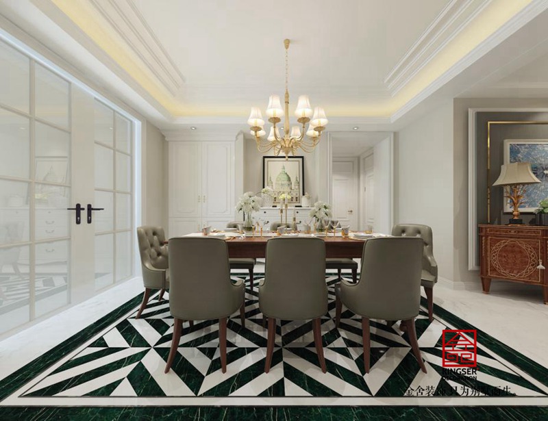 石家莊金舍裝飾-融創(chuàng)中心180平米美式風(fēng)格裝修效果圖。美式風(fēng)格一般要求簡(jiǎn)潔明快,同時(shí)裝修較其它風(fēng)格要更明快光鮮,通常使用大量的石材和木飾面裝飾,這不僅反映在軟裝擺件上對(duì)仿古藝術(shù)品的喜愛,同時(shí)也反映在裝修上對(duì)各種仿古墻地磚、石材的偏愛和對(duì)各種仿舊工藝的追求上。總體而言,美式田園風(fēng)格的客廳是寬敞而富有歷史氣息的。