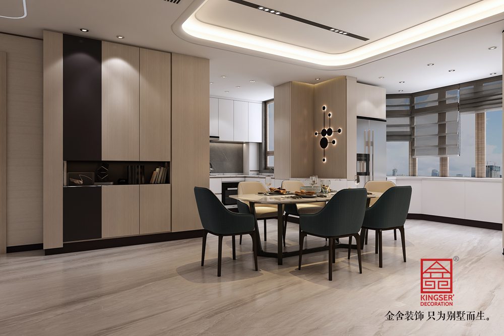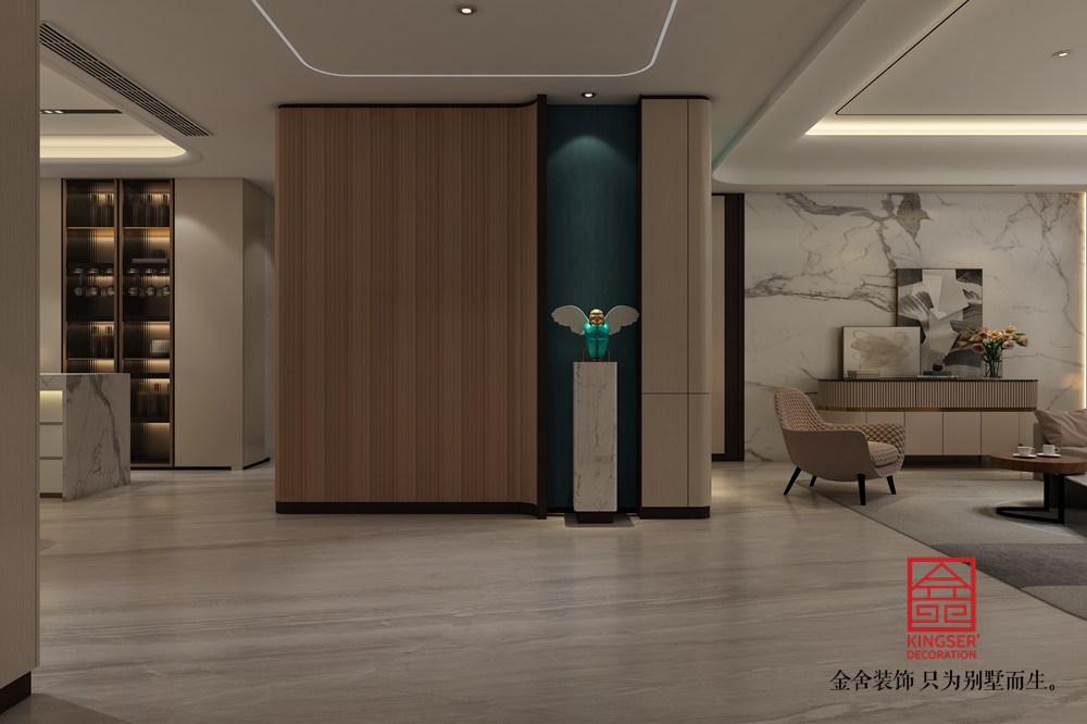 石家莊金舍裝飾-榮盛華府205平米現代風格裝修效果圖。此方案的風格傾向定位于現代風格。業主崇尚清新時尚的現代風格。通過與業主的深入溝通,本著輕裝修,重裝飾的原則,同時圍繞著業主對房子功能的要求,合理的對空間進行了改造與工能劃分。本案的設計重點是會客空間與門廳、餐廳以及過道空間互通與交流,從設計手法上采用了從墻面上的線與面銜接呼應,以及頂面的空間的虛擬劃分。墻漆、壁紙與家具配飾的使用,使空間更加豐富與溫馨。達到各功能空間融匯貫通的目的。成熟細致的線條結合家具與軟裝,烘托內斂優雅的大宅風范。開放式廚房,增加了家庭的互動性。