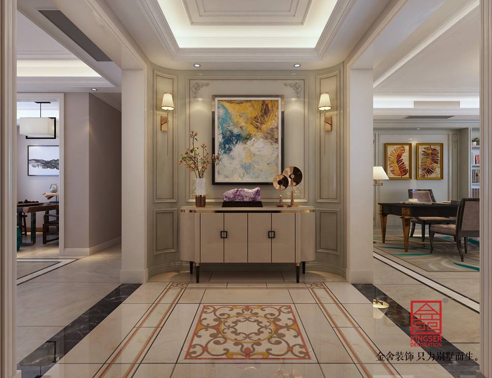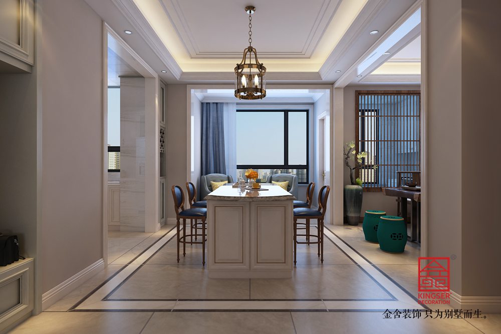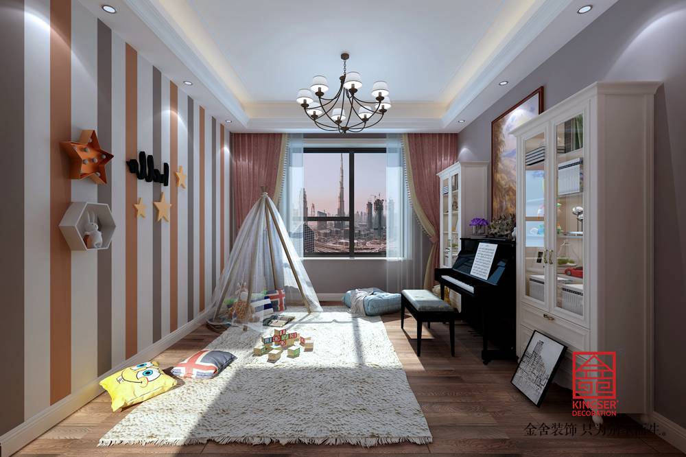 設計說明:此案例為石家莊金舍裝飾-榮盛華府200平米混搭風格裝修效果圖。傳統的客廳以電視墻為主導,沙發和茶幾的高度往往相差不大,這樣的高度差對于孩子寫作業或是成年人看書寫字和使用電腦是沒有舒適度可言的,因此一些有工作和學習需求的家庭可以考慮把家庭工作室融入客廳,利用靠墻的大操作臺和各種墻面擱板架,滿足多人工作的需求
