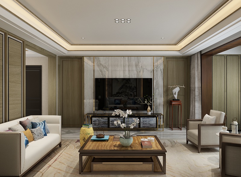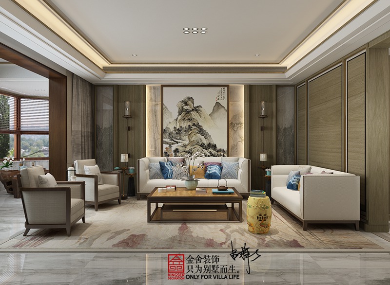 此案例為石家莊金舍裝飾-榮盛華府205平米新中式風格裝修效果圖。設計定位就是新中式風格,這次設計的主要元素就是具有東方韻味的中國山水畫,中國山水畫集中體現(xiàn)了中國人與作為審美客體的自然風景的審美關系,具有較強的抒情性。它貫穿了整個空間的不同區(qū)域,通過裝飾畫、壁紙等不同形式,傳達著整個空間氣質的連貫性和一致性。在客廳的電視墻和沙發(fā)背景墻我都用了石材原木色,使整個空間看起來風格更加凸顯,使人感到靜謐。整個空間以深黃色和白色為主,除了偶爾讓人心動的紅色,眼睛所見之處,都是不經(jīng)多加修飾的木的紋理和原色,讓空間更顯自然和親近。