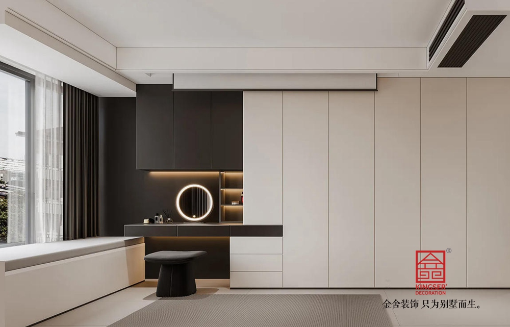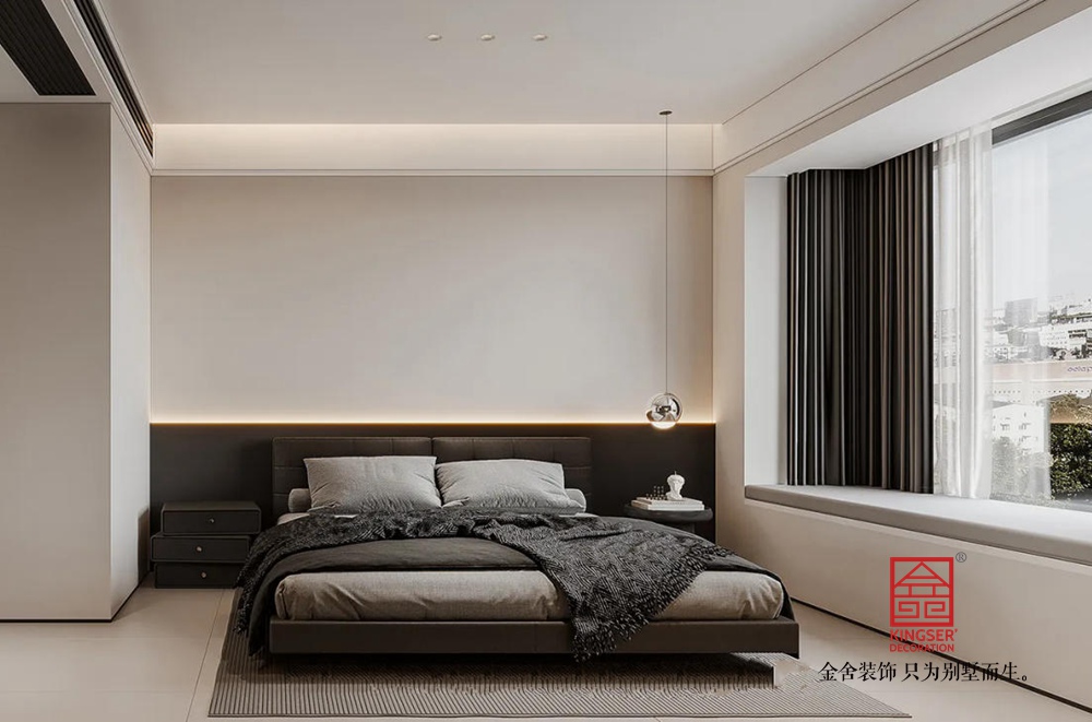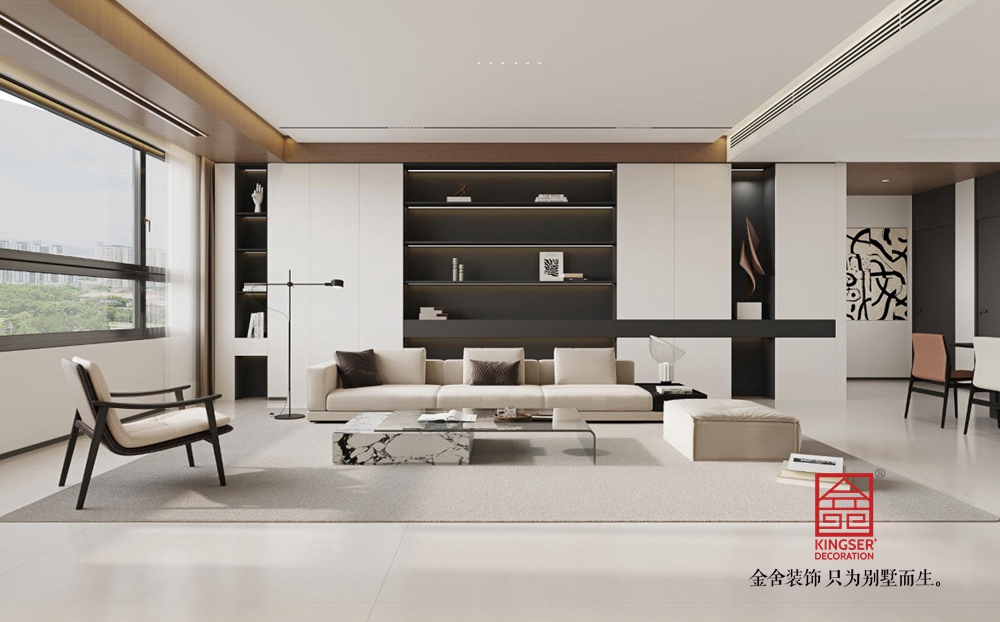 空間布局上,采用開放式設計,讓客廳與周邊區域自然銜接,增強了空間的通透感與互動性。大面積的落地窗是設計亮點,引入充足自然光線,同時將城市景觀納入室內,使空間與外界環境有機融合。