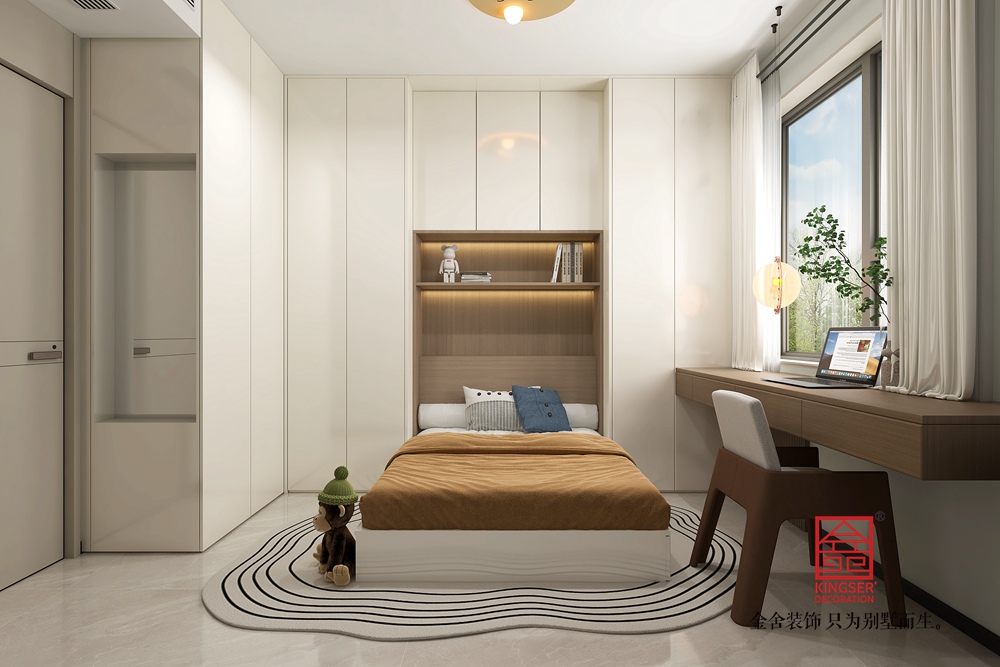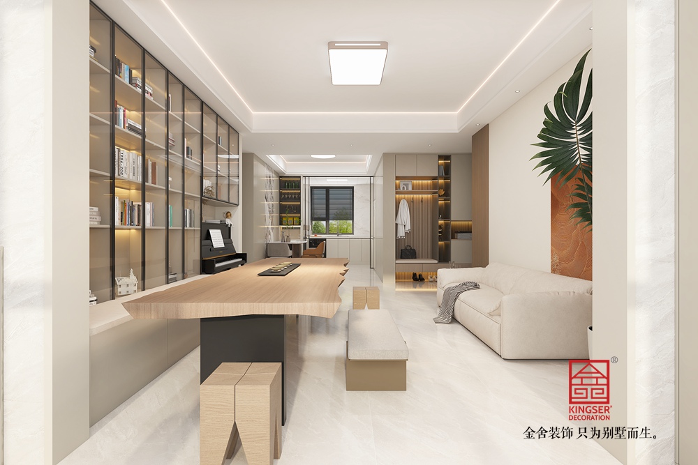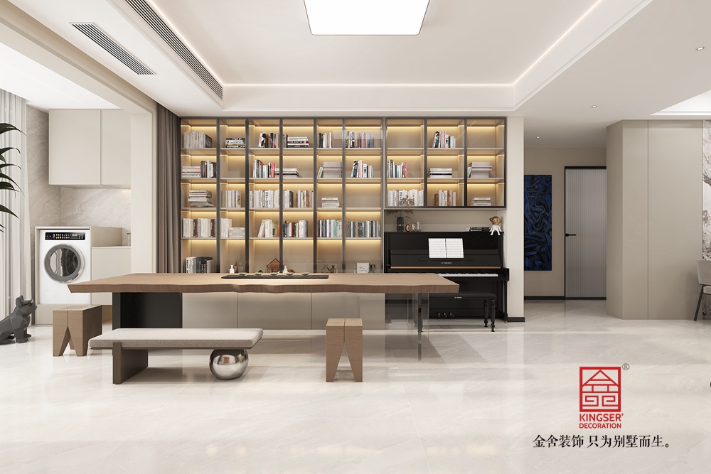 此空間采用去客廳化設(shè)計,打破傳統(tǒng)客廳單一社交功能的局限,打造出集閱讀、藝術(shù)、休閑等多元體驗(yàn)于一體的復(fù)合區(qū)域。 整面玻璃書柜兼具收納與展示功能,暖光加持下,書籍仿若藝術(shù)品,營造出靜謐的閱讀氛圍。原木長桌造型獨(dú)特,成為空間核心,可滿足閱讀、手工等多樣需求,搭配簡約座椅與長凳,為互動交流提供靈活場景。鋼琴的融入,為空間注入藝術(shù)氣息,讓居者能隨時沉浸于音樂世界。