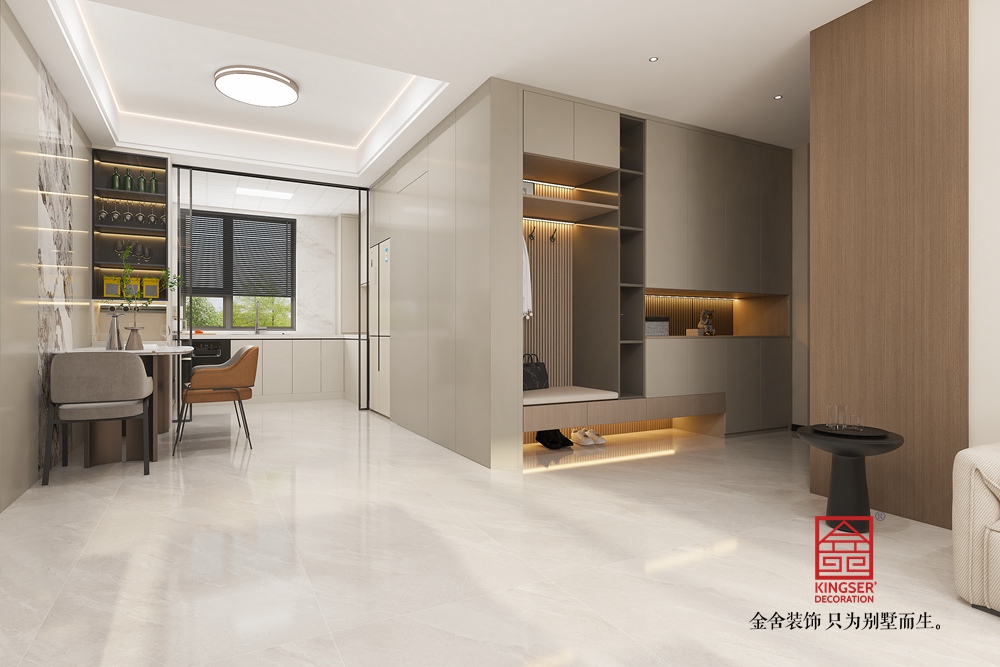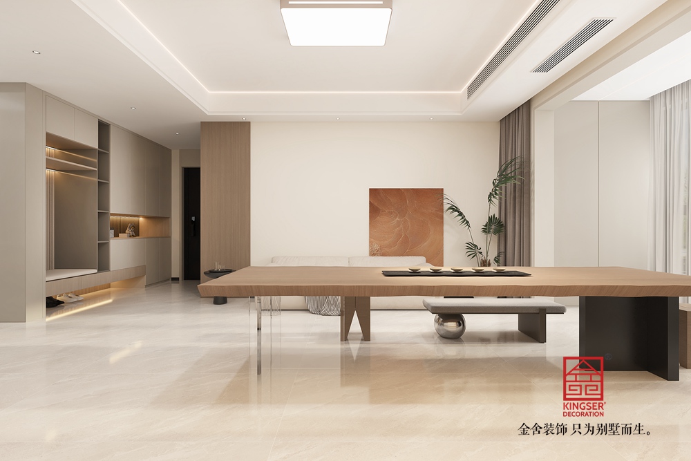 材質(zhì)上,原木的自然質(zhì)感、大理石的光潔以及金屬的精致相互融合,層次豐富。燈光設(shè)計巧妙,嵌入式燈帶與頂燈營造出柔和均勻的光照,凸顯空間通透感。整體設(shè)計摒棄傳統(tǒng)客廳的刻板,以實(shí)用與美學(xué)兼具的布局,為居者帶來更具個性與深度的生活體驗(yàn),詮釋了去客廳化設(shè)計對生活方式的創(chuàng)新與升級。