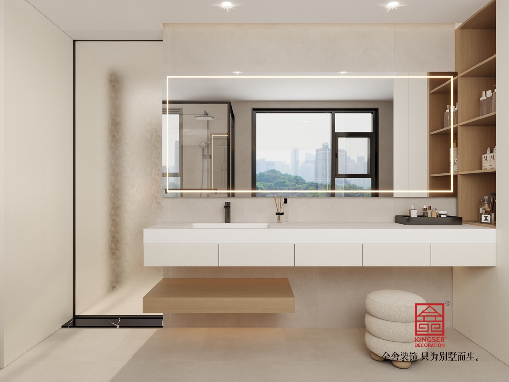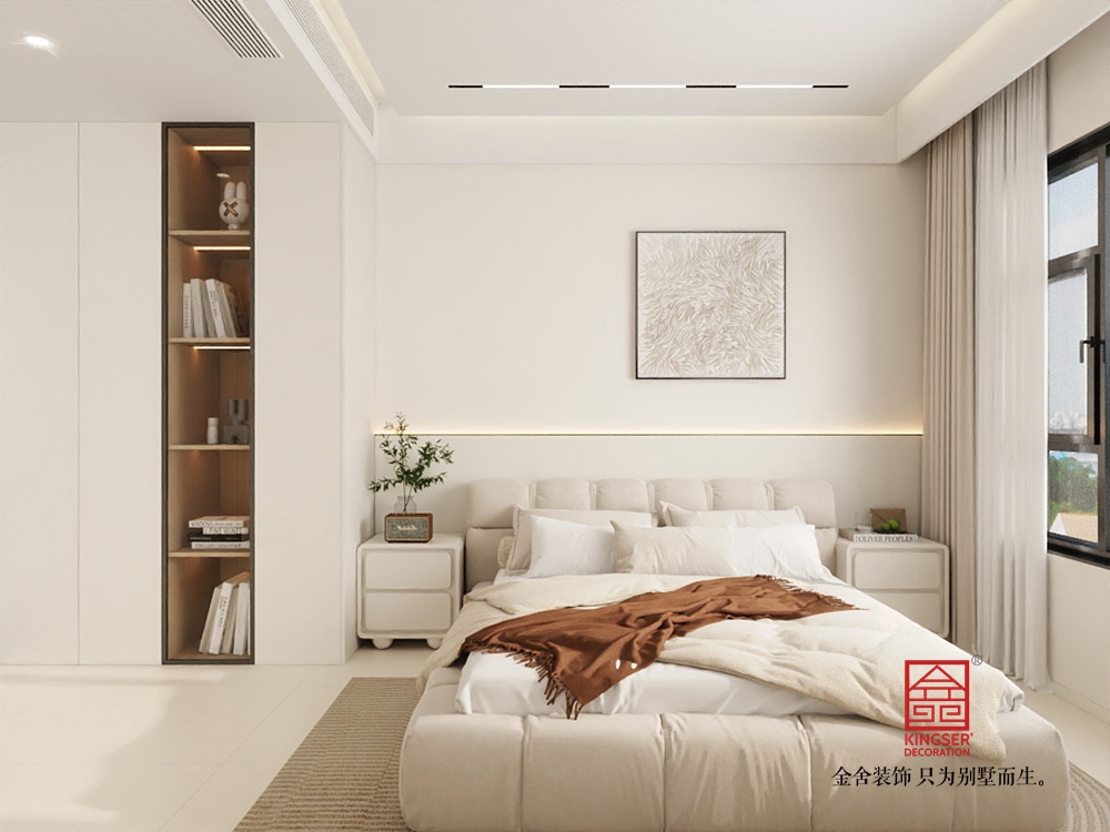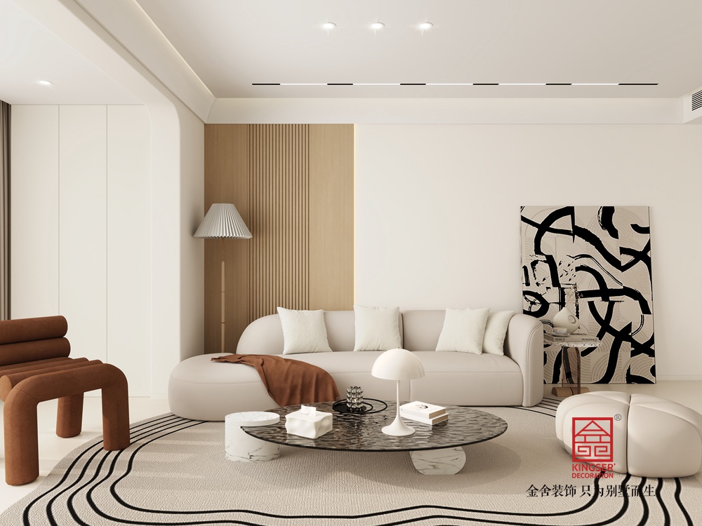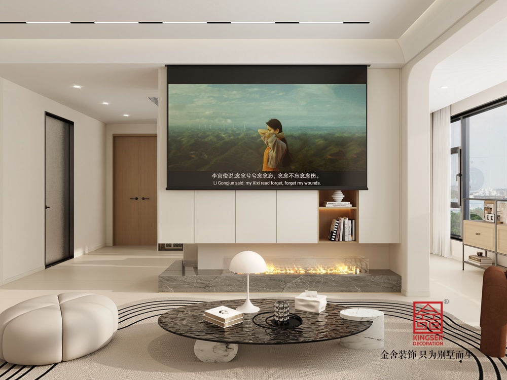 本客廳設計聚焦現代輕奢與實用功能的融合。以簡潔的白色為主調,搭配木質元素,營造出溫馨且雅致的氛圍。墻面設置投影幕布,結合下方的仿真火焰裝置,打造出兼具觀影與氛圍感營造的核心區域,滿足休閑娛樂需求。家具選擇上,弧形白色坐凳與造型獨特的茶幾,為空間注入柔和與精致感。整體布局通透,大窗戶引入充足自然光線,讓空間更顯開闊舒適,是一個集美觀與實用為一體的高品質起居空間。
