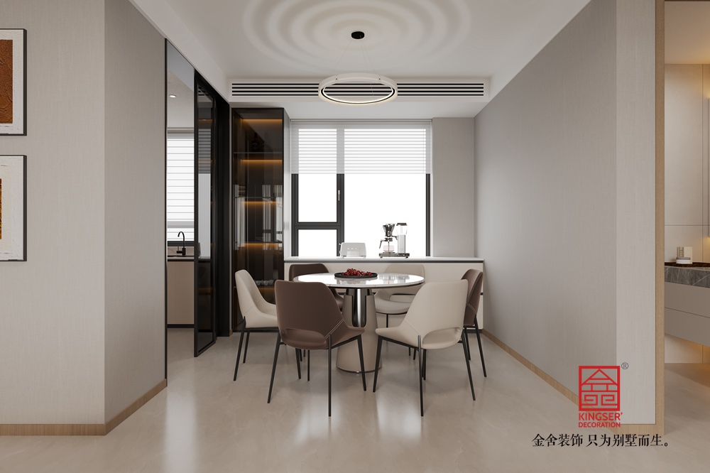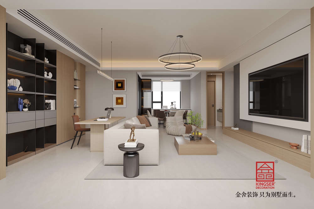 本客廳設計以現代簡約風格為核心,主打溫暖柔和的大地色系。空間布局上,將休閑與功能區巧妙融合,背景墻處的柜體設計,兼具收納與展示功能,燈光點綴更顯精致。家具選擇注重舒適與質感,淺米色大沙發搭配棕色系單品,營造出溫馨和諧的氛圍。雙層環形吊燈造型別致,為空間增添時尚感。整體通過材質、色彩與燈光的搭配,打造出一個舒適、雅致且充滿生活氣息的別墅起居空間。