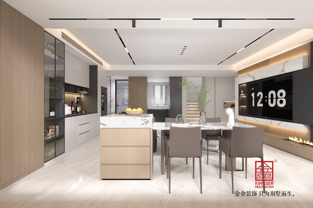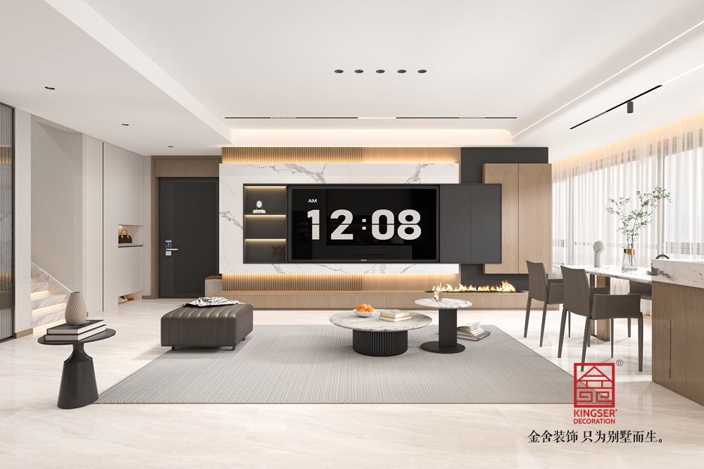 材質(zhì)上融合不同質(zhì)感,電視背景墻用大理石紋理提升高級感,木質(zhì)線條增添溫潤氣息,淺灰色地毯則柔化地面硬度,讓空間更顯溫馨。