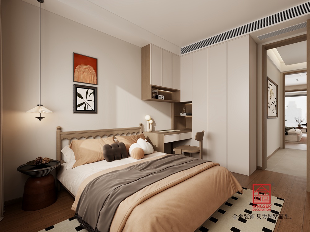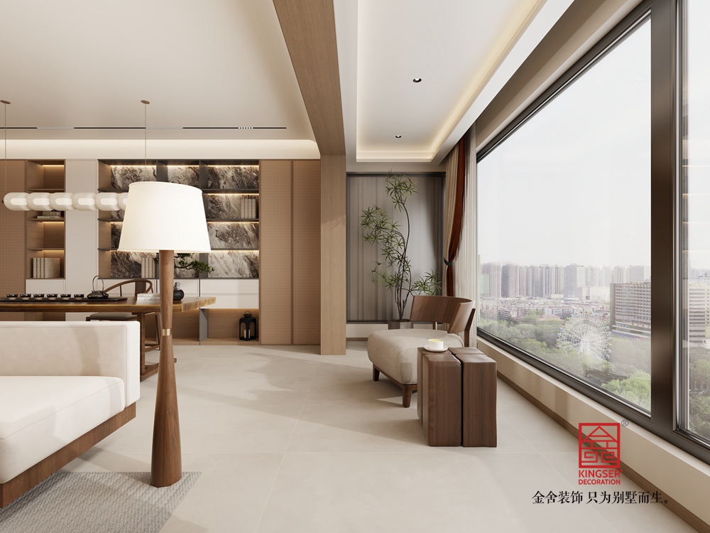 寬闊的落地窗引入充足自然光線,搭配雅致的窗簾,讓室內外景致交融。空間中點綴的綠植、中式擺件,以及墻上的簡約裝飾,都為空間增添了文化氣息與自然意趣,打造出一個兼具實用性與美學價值,能讓人在現代生活中感受東方美學底蘊的愜意居所。