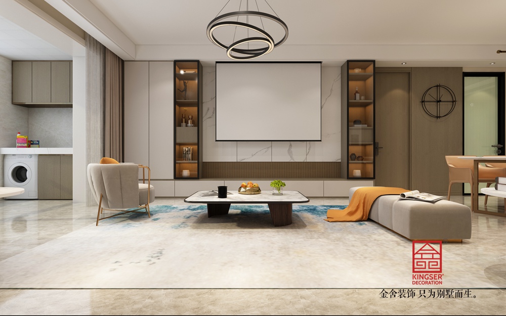 燈光設計巧妙,頂部的環形吊燈造型現代,與墻面的射燈共同營造出溫馨且富有層次的光影效果。整體設計將現代簡約的時尚感與居家的溫馨感完美融合,每一處細節都體現出對品質生活的追求,打造出一個舒適、雅致且極具格調的現代客廳空間。