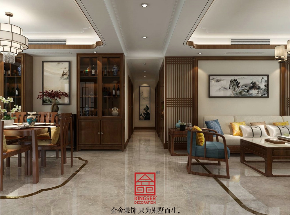 【設計主創】:楊佼 設計說明:此案例為石家莊金舍裝飾-東南智匯城153平米中式風格裝修效果圖。新中式風格是中式元素與現代材質的巧妙兼柔的布局風格,它同時明清家具、窗欞、布藝床品相互輝映,經典地再現了移步變景的精妙小品。中國風并非完全意義上的復古明清,而是通過中式風格的特征,表達對清雅含蓄、端莊豐華的東方式精神境界的追求。